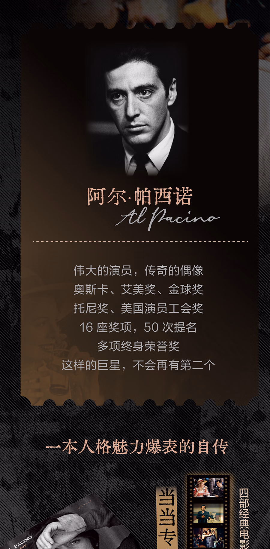 全书读起来像一部意识流的蒙太奇。它不似传统名人回忆录工整,而是跳跃、喃喃自语,甚至自相矛盾的。这种“混乱”是帕西诺式的:一个常年沉迷于酒精和药物,又在晚年皈依清醒的灵魂;一个在巅峰期中断电影事业投身戏剧的本格演员;一个在2011年赔光了五千万美元宣布破产,却又毫不绝望地总结道“至少我还活着”的矛盾体。他对自己进行着毫不留情的解剖,坦诚地审视自己的无数个错误。